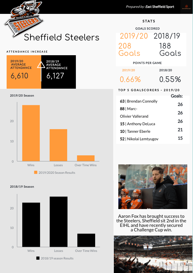 An infographic which compares Sheffield Steelers’ 2018/19 and 2019/20 season respectfully.