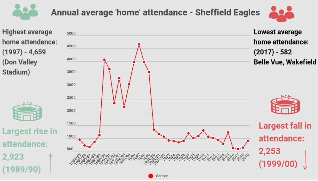 Inside Sheffield’s first five seasons attendance numbers rose to 1,127 before the Eagles moved out of Owlerton Stadium due to health and safety issues at the ground.